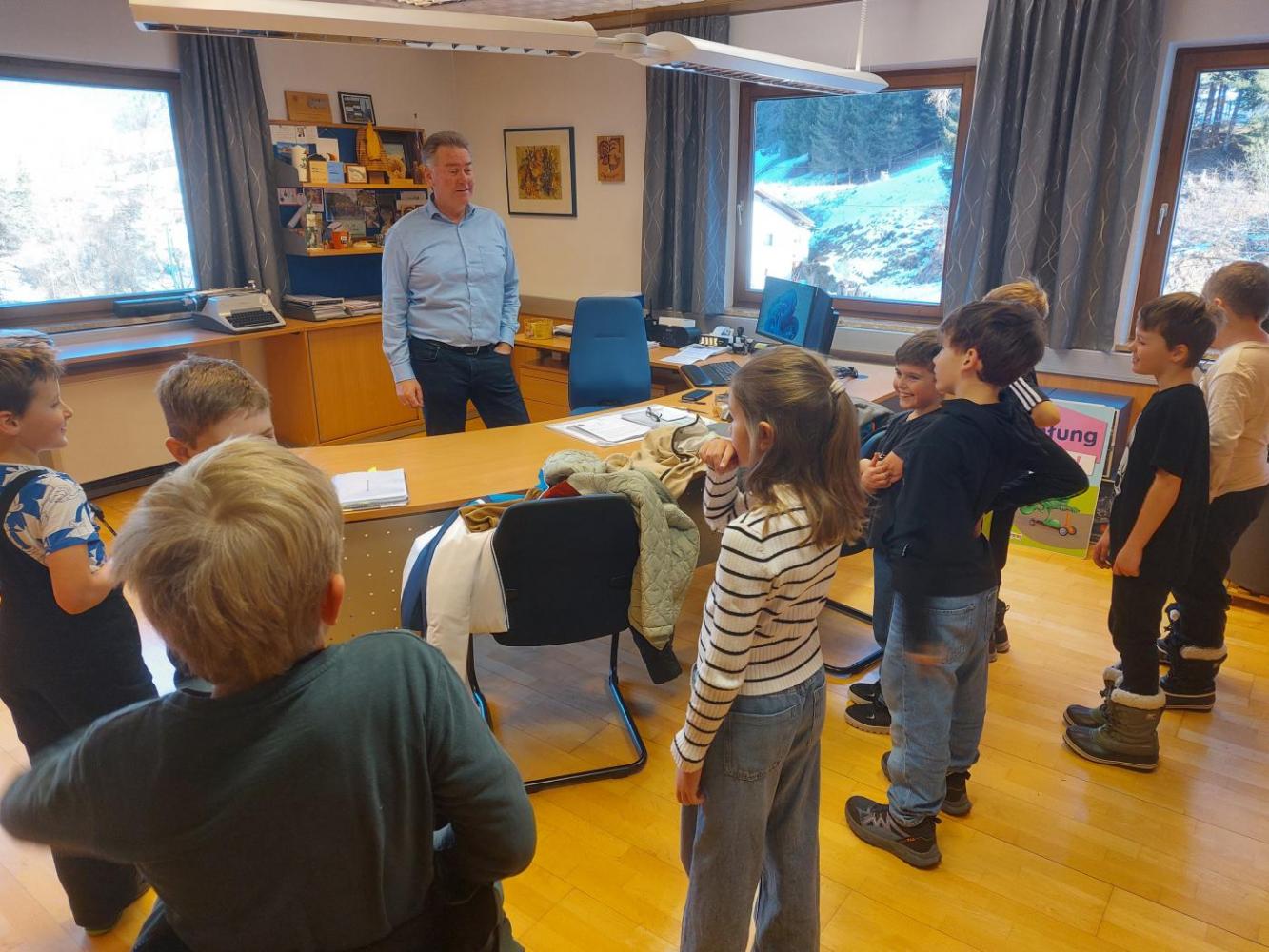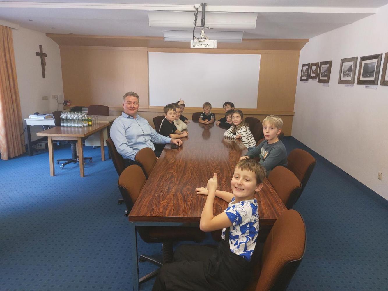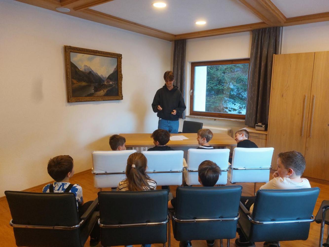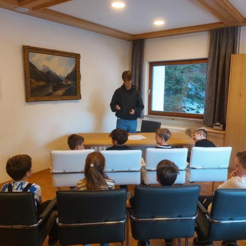 Im Gemeindeamt wurden die Kinder von Bürgermeister Elmar Haid, Amtsleiter Andreas Rauch, Gemeindesekretär Julian Mair und Waldaufseher Michal Erhart empfangen. Gemeinsam erkundeten sie die verschiedenen Räumlichkeiten und erhielten spannende Einblicke in die vielfältigen Aufgaben und Zuständigkeitsbereiche der Gemeinde.