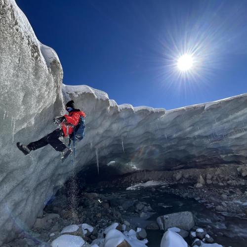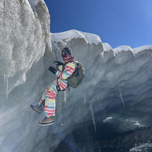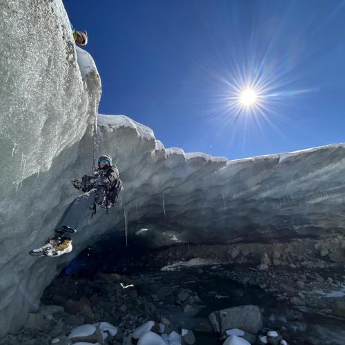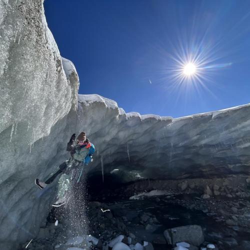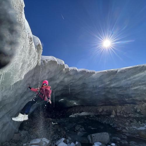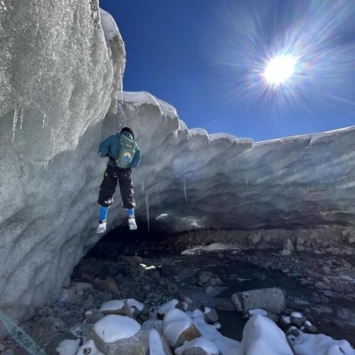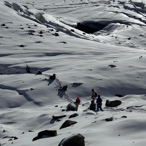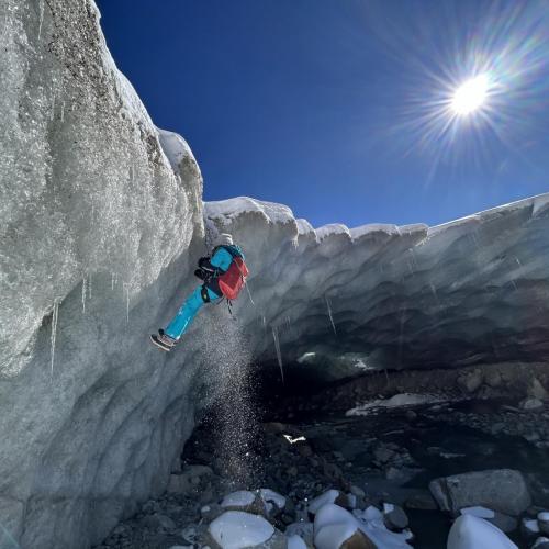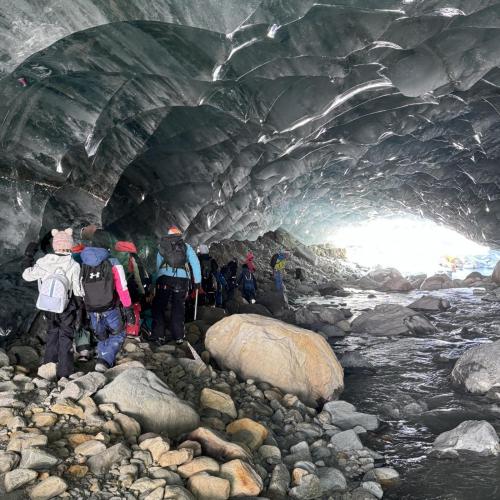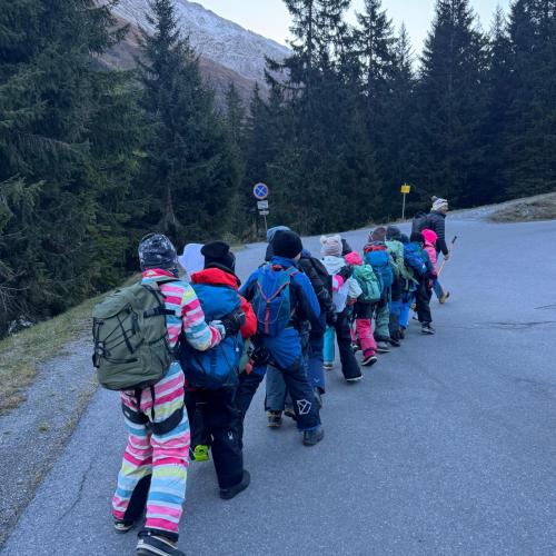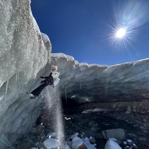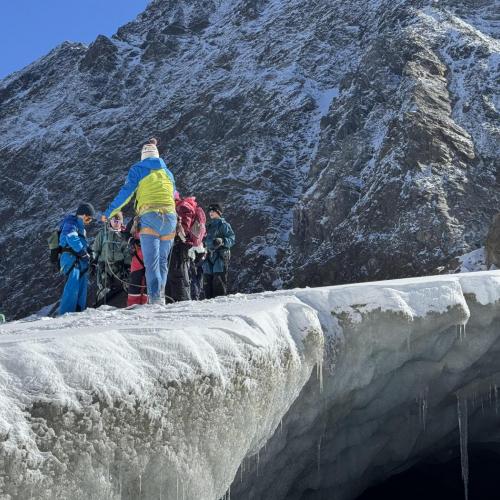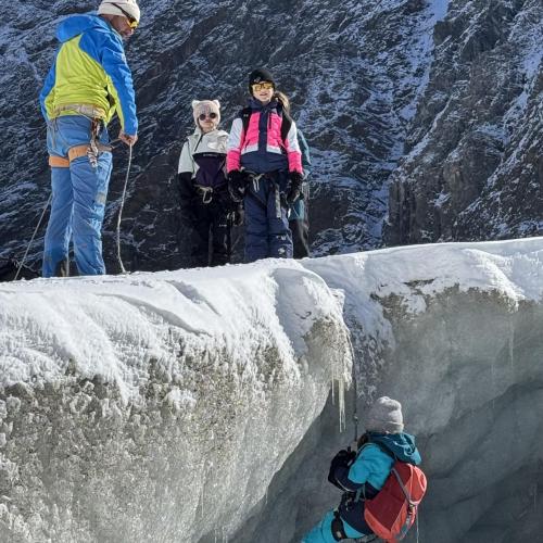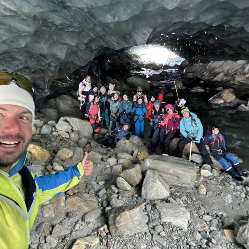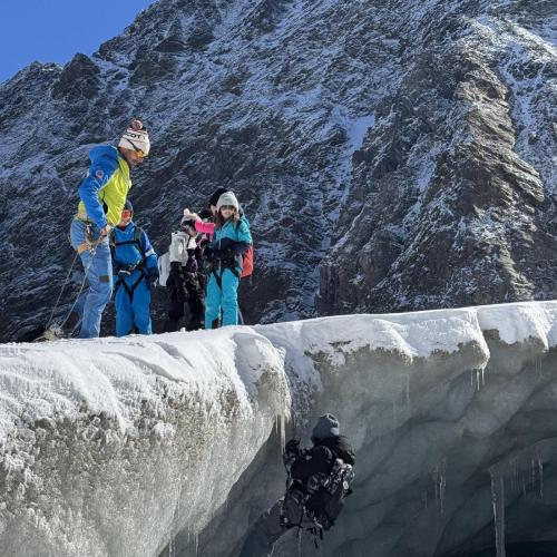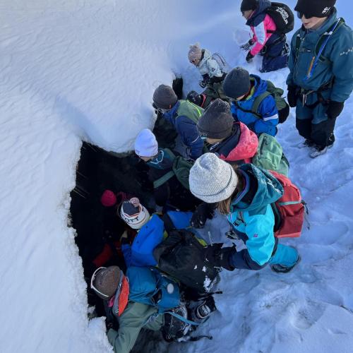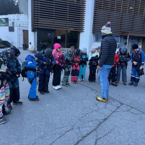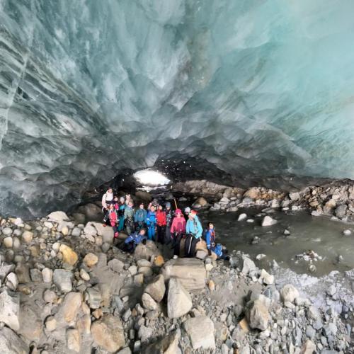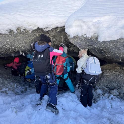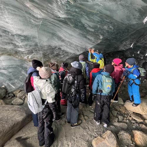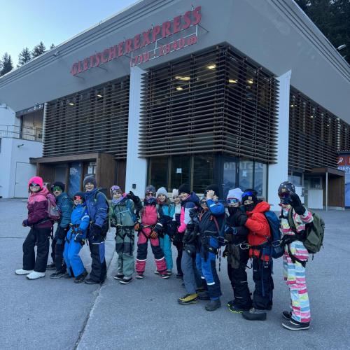 In der Früh erwartete Raphael die Kinder und Lehrerinnen bereits am Gletscherparkplatz. Nach der Ausgabe der Klettergurte ging es mit dem Gletscherexpress weiter hinauf. Mit Rutschtellern flitzten alle die Piste hinunter bis zum Rand des Eises – ein rasanter Start des Abenteuers. Gemeinsam in zwei Seilschaften wanderten alle über den Gletscher und überquerten dabei sogar einige Spalten. Während der ganzen Tour erzählte Raphael viel Wissenswertes über die Namen der Gletscher, ihre Entstehung, die Geologie, das Klima, sowie die verschiedenen Arten von Spalten. Ein ganz besonderes Erlebnis war dann das Abseilen in eine Eishöhle – ein Moment, den sicher niemand so schnell vergessen wird. Zum Abschluss gab es im Restaurant für alle ein Getränk und eine süße Stärkung.